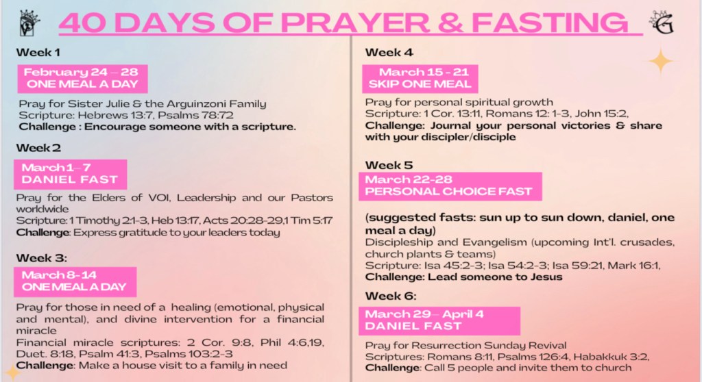 Over these 40 days, we will fast, pray, and believe God for spiritual growth, healing, discipleship, church expansion, and a global harvest of souls. Each week carries a specific focus — from leadership covering, to healing and miracles, to evangelism and resurrection power.